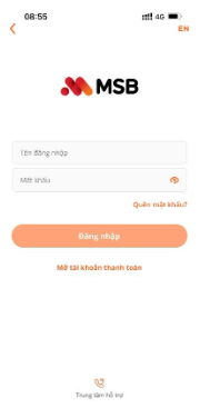 KH đăng nhập App MSB mBank theo tên đăng nhập và mật khẩu đã thiết lập. · Tên đăng nhập: Là số điện thoại mở tài khoản · Mật khẩu: Đã thiết lập tại Bước 2-Mở tài khoản thanh toán MSB |